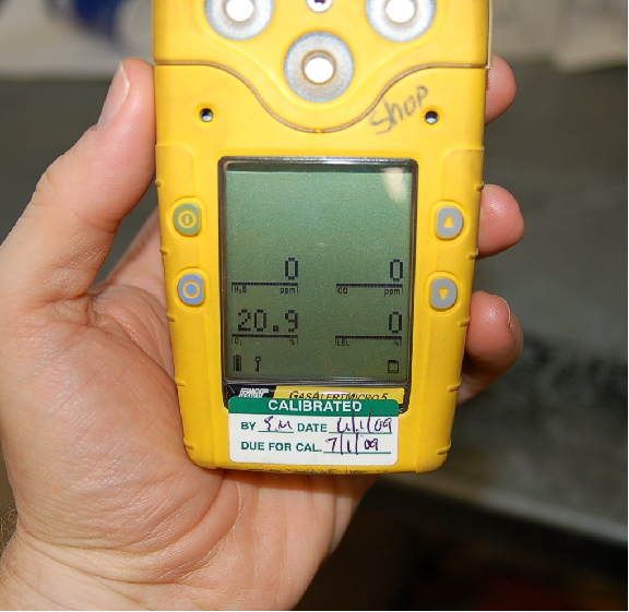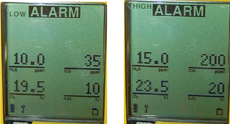 A close-up photograph taken of the monitor’s alarm thresholds reveals the relative concentrations of four gases monitored by the device. Two distinct alarm levels – “low” (alert) and “high” (danger) – exist to warn the user of threats: