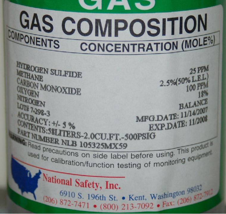 Like all safety-related devices, portable gas analyzer require regular “proof-testing” and calibration. In order to accurately check the response of a gas analyzer, it must be exposed to gases of known concentrations. Special mixtures of “test gas” for safety analyzers are available from chemical supply companies, the next photograph showing the certified concentrations of different gases contained inside the pressurized test cylinder: