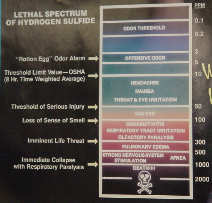 Hydrogen Sulfide (H2S) is a highly toxic gas, with a pungent “rotten eggs” odor at low concentrations but no visible color. At higher concentrations, the gas acts as a nerve agent to de-sensitize human smell, so that it seems odorless. Its paralytic effect on smell extends to more important bodily functions such as breathing, causing rapid loss of consciousness and asphyxiation. A photograph of a safety chart (taken at a wastewater treatment facility) shows just how toxic hydrogen sulfide gas is: