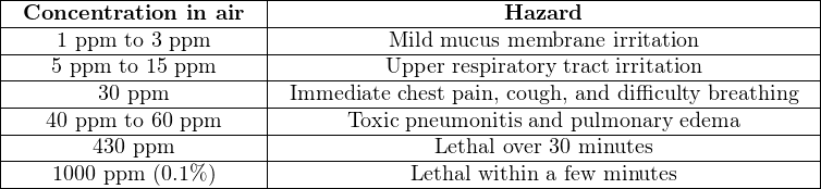 The following table correlates levels of chlorine gas concentration in ambient air with degree of hazard. Note the unit of measurement for chlorine concentration in air – parts per million (ppm). Bear in mind that one part per million is equivalent to just 0.0001 percent: