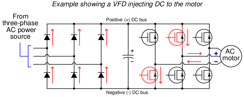 Modern solid-state AC motor drives easily provide DC injection for braking. All they need to do is energize their output transistors in such a way that one or more of the stator windings sees a constant voltage polarity instead of an alternating polarity as is the case when the motor is running. The following diagram shows the power flow into the motor during DC injection: