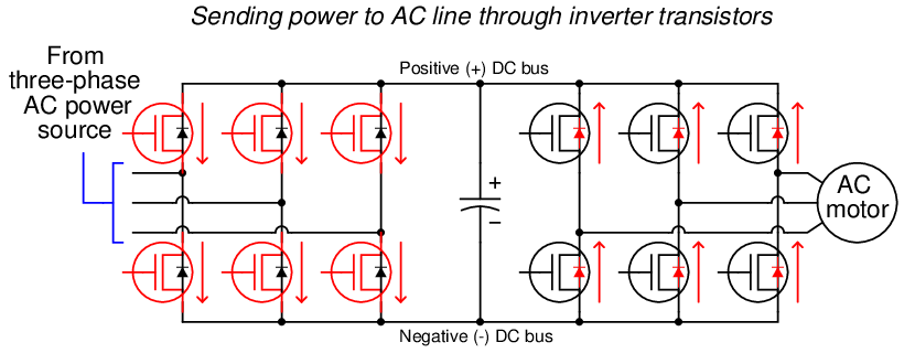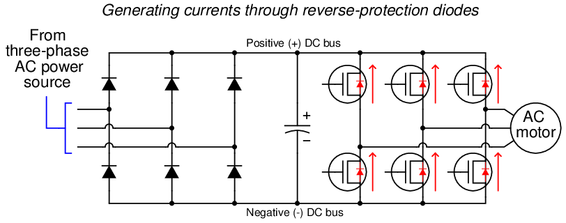 In a VFD circuit, the “reverse” power flow received from the motor takes the form of currents traveling through the reverse-protection diodes placed in parallel with the output transistors. This in turn causes the DC bus filter capacitor to charge, resulting in a raised DC bus voltage:
