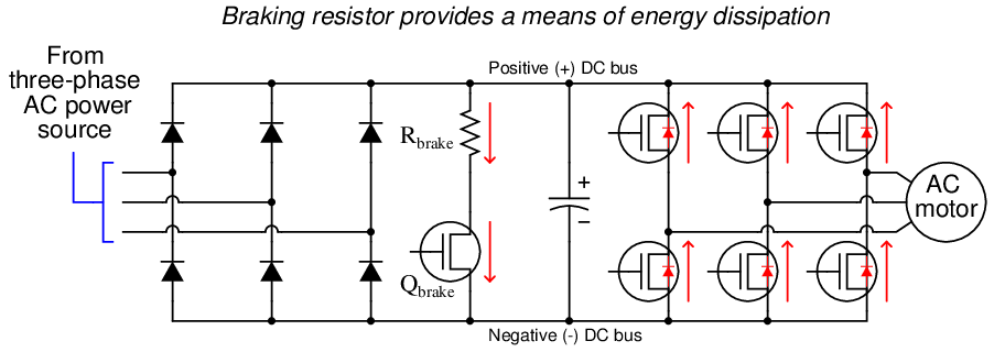 When acting as an electrical generator, an induction motor requires an input of mechanical energy. That is, it will require mechanical effort to keep the rotor spinning faster than synchronous speed, since the motor naturally “wants” to spin at synchronous speed or slower. This means a generating motor acts as a brake, attempting to slow down whatever is keeping it spinning faster than synchronous speed. This braking effect is in direct proportion to how much the generated energy is used or dissipated by an electrical load. If we build a VFD to dissipate this energy in a controlled manner, the motor will have the ability to act as a dynamic brake.
