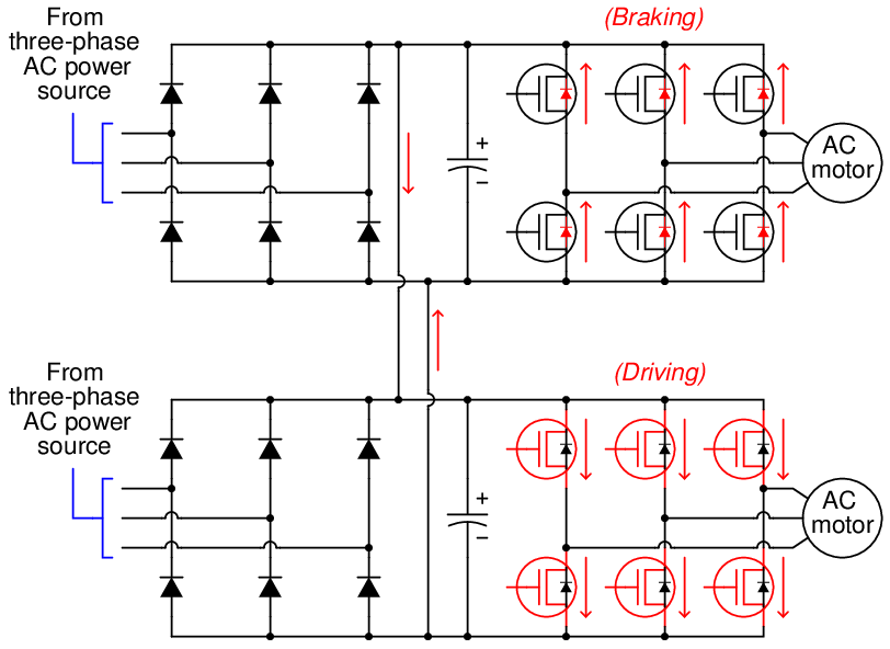 The following schematic diagram shows two interconnected VFD circuits, with the upper drive braking and the lower drive motoring (driving):
