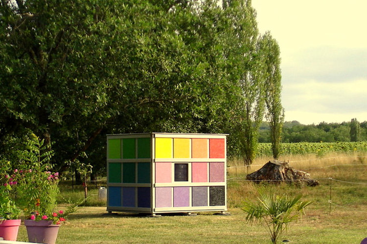 The cabin is an example example of the pixel design and craftsmanship. “ Thanks to an ingenious rail system, its colored sides can slide and interchange. This wooden shelter, which has a very contemporary style, measures 6 m².