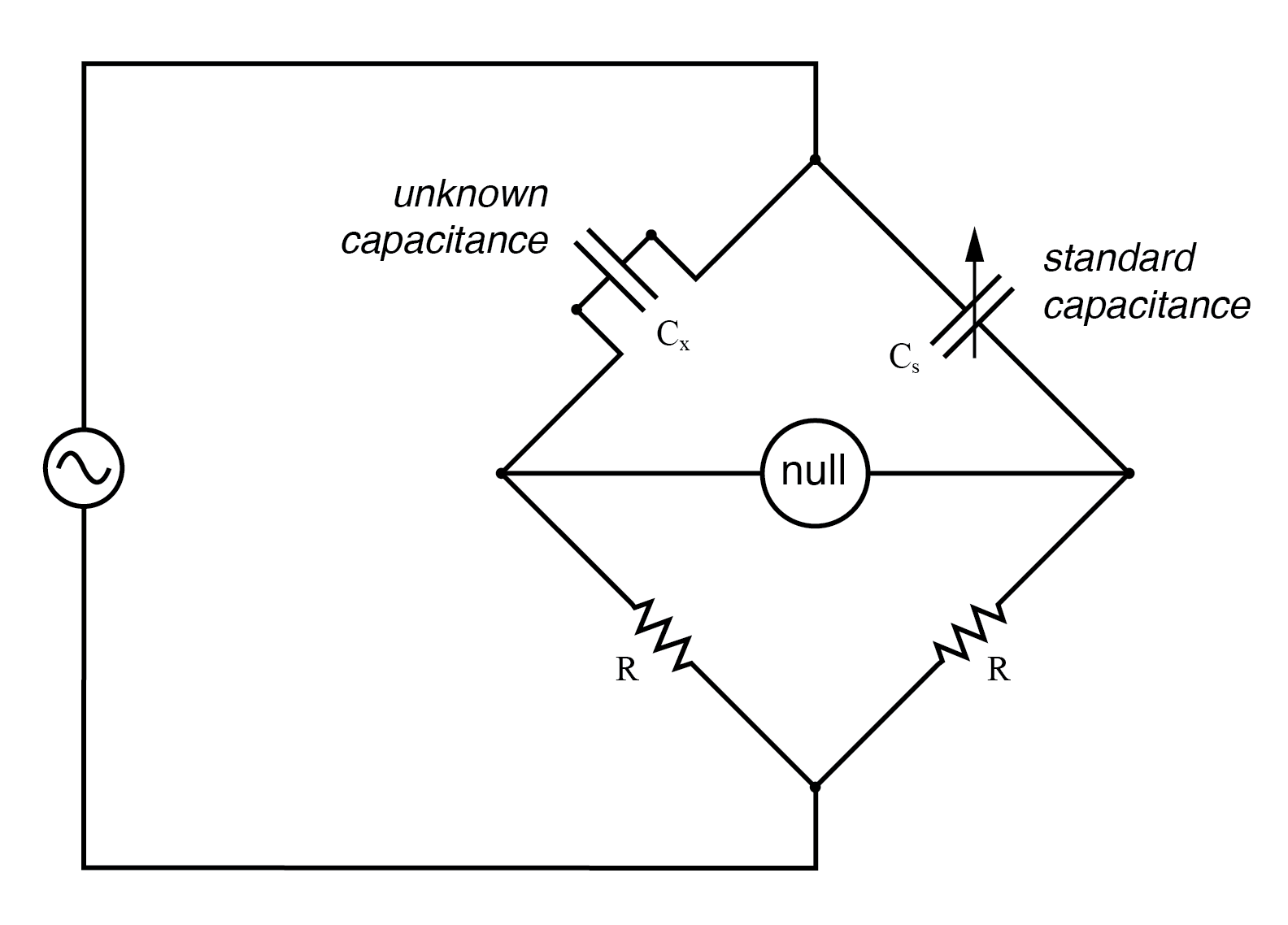 Symmetrical bridge measures unknown capacitor by comparison to a standard capacitor.