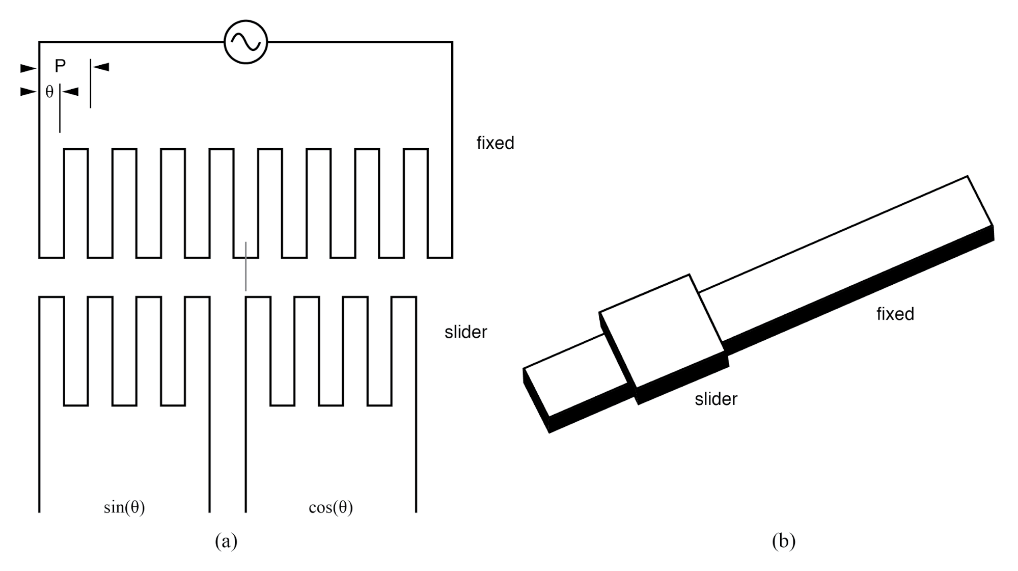Inductosyn: (a) Fixed serpentine winding, (b) movable slider 2-phase windings. Adapted from Figure 6.16 [WAK]