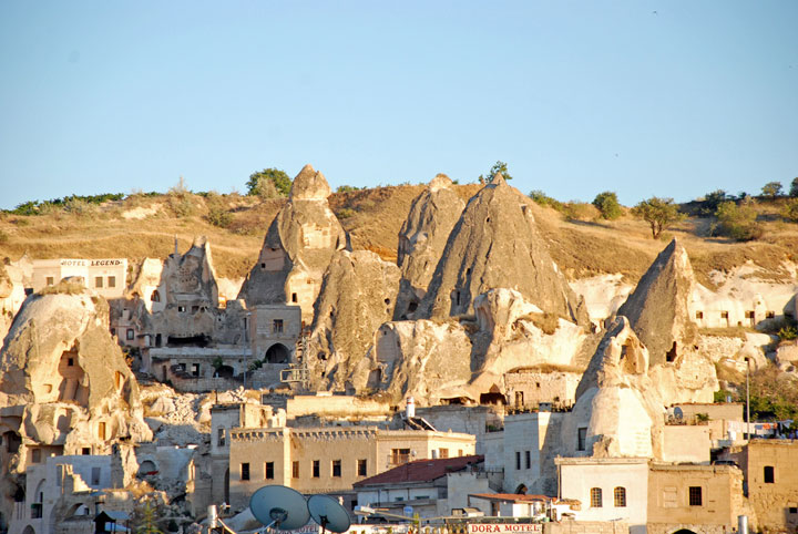 Goreme is located in the region of Cappadocia, Turkey. This region is known for its many of unique rock formations. The valley around this area juxtaposes the modern architecture with traditional towns and villages carved into the rocks of the valley.