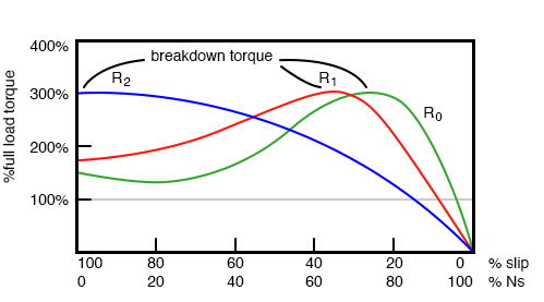 The breakdown torque peak is shifted to zero speed by increasing rotor resistance