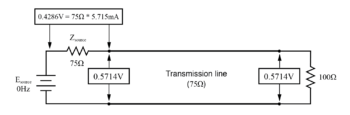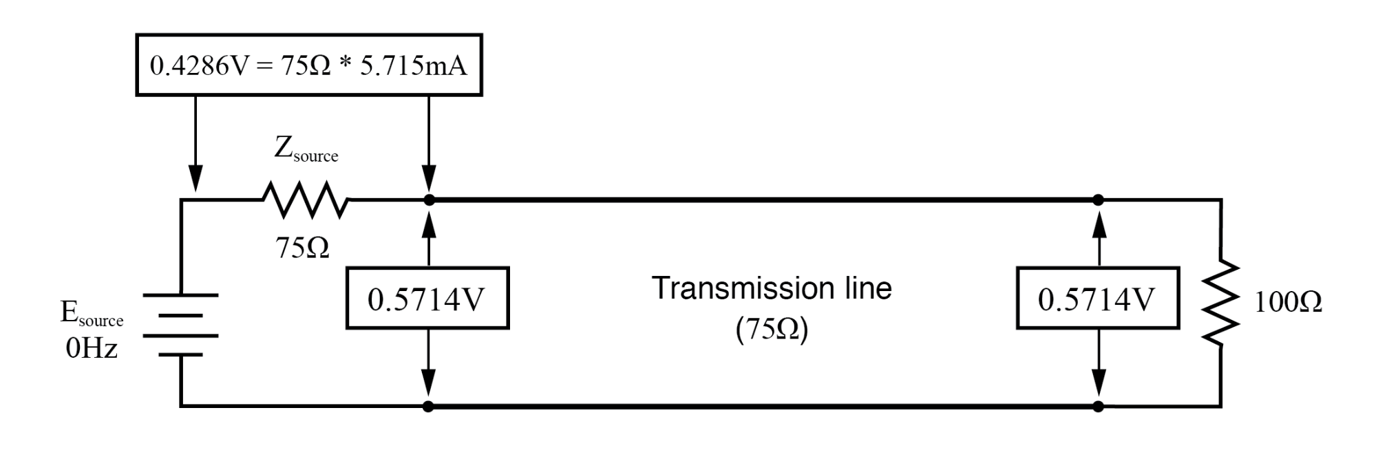 At f=0 Hz: input: V=0.57.14, I=5.715 mA; end: V=0.5714, I=5.715 mA