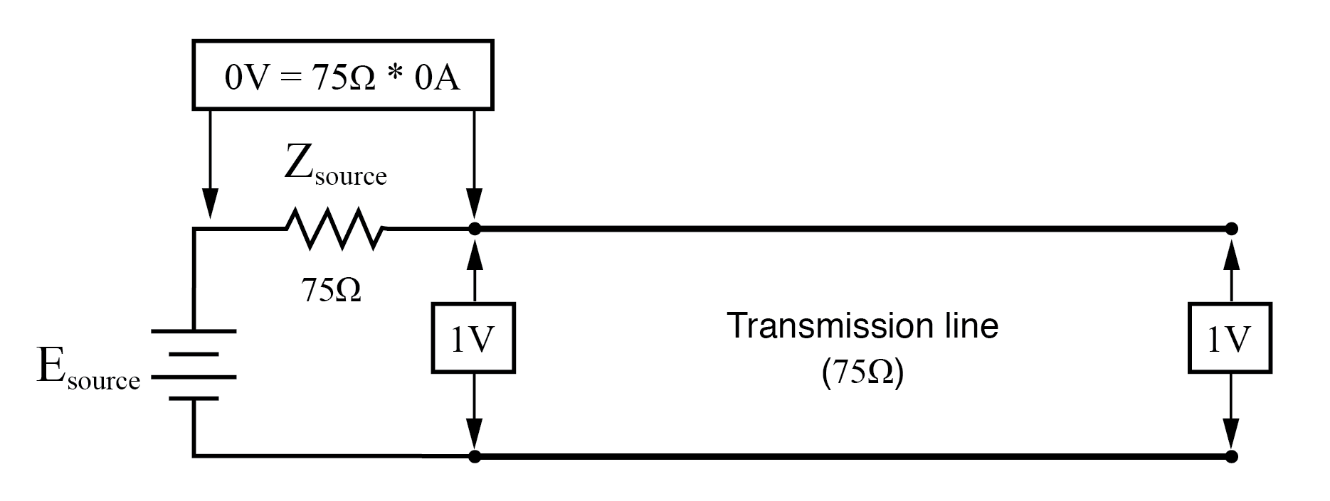 At f=0: input: V=1, I=0; end: V=1, I=0.