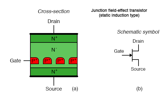 Junction field effect transistor (static induction type): (a) Cross-section, (b) schematic symbol.