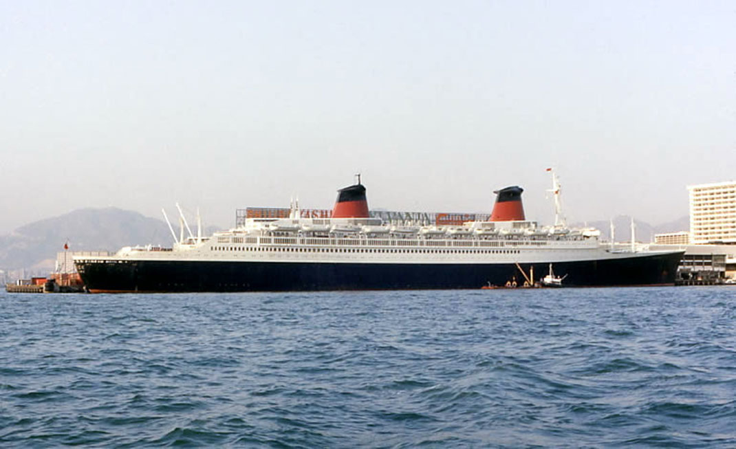 The Queen Elizabeth of the company Cunard Line is the improved sister ship of Queen Mary. It measures 314 meters. Launched in 1938, it was used to transport troops between the United States and Great Britain. In 1972, it was destroyed by a fire and was abandoned in Hong Kong bay.