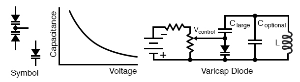 Varicap diode: Capacitance varies with reverse bias. This varies the frequency of a resonant network.