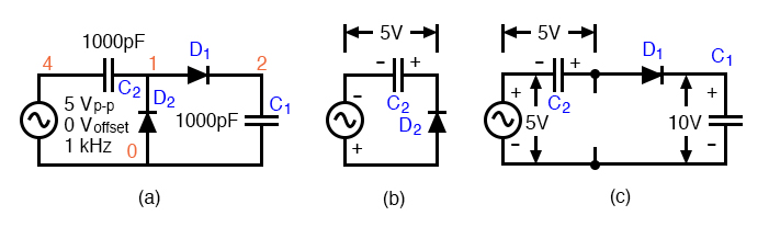 Half-wave voltage doubler (a) is composed of (b) a clamper and (c) a half-wave rectifier.