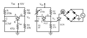 PUT relaxation oscillator with component values. PUT drives SCR lamp dimmer.