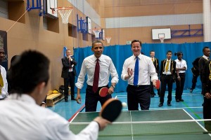 President Barack Obama and British Prime Minister David Cameron play table tennis with students at Globe Academy in London, England, May 24, 2011. (Official White House Photo by Pete Souza)