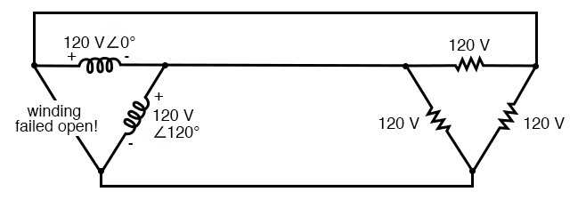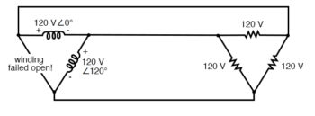Even with a source winding failure, the line voltage is still 120 V, and load phase voltage is still 120 V. The only difference is extra current in the remaining functional source windings.