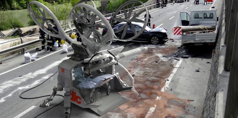 The machine they have imagined is a quadricopter having the size of a car, two-seater, capable of carrying a wounded and a pilot or a member of the medical staff. As imagine these designers, the device can be piloted manually or fly autonomously like a drone .”