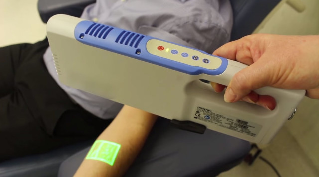 This device may look radioactive, but in reality it is not so and very safe. It works by shining the near infrared light on your arm, which is then absorbed by the deoxygenated hemoglobin in your veins. This creates a vivid picture of your veins that nurses can use to insert the needle.