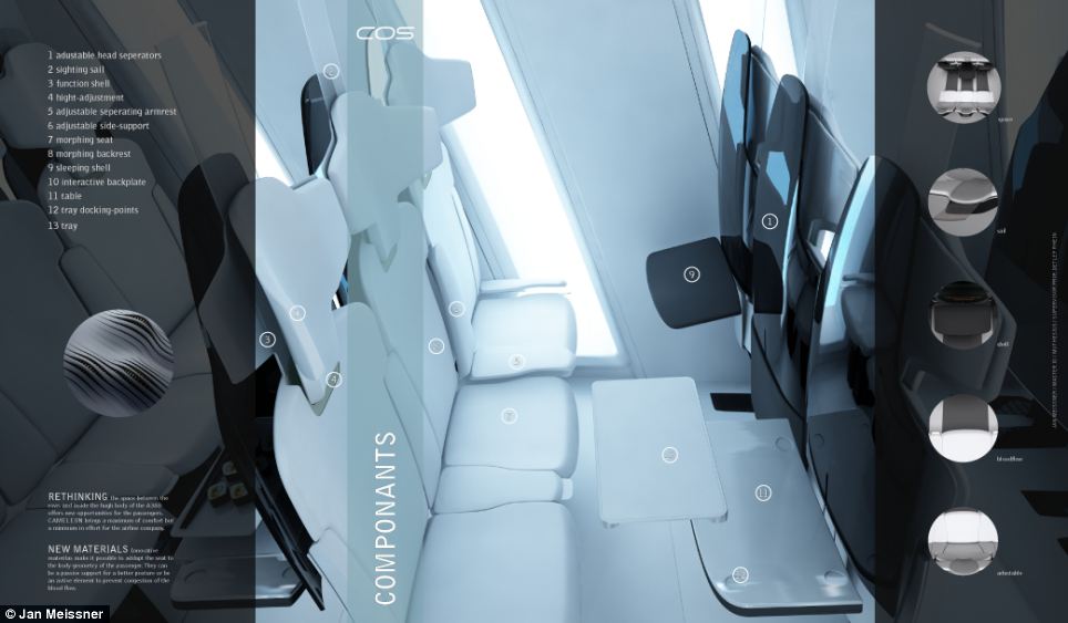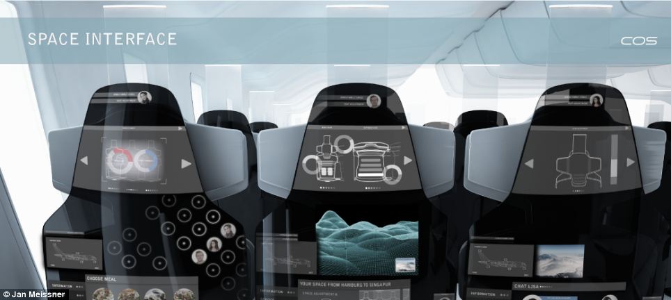 These new seats can easily be fitted into Airbus A3880. The design consists of smart seats which can be adjusted according to will and comfort of passenger. The big screen on the front offers many interesting features such as interactive gaming and acoustic video of the plane’s surroundings. Two or more screens can even be joined to generate the panoramic view outside aircraft. You may use your gestures to control the screen or you can use its touch screen characteristic to interact with it. An innovative feature of these screen is the ability to join two or more screen together? Indeed, it one of the most innovative things.