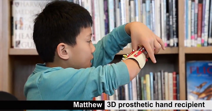 Mason Wilde has done a great service to his neighbour Matthew who was born with only an inch of his right hand. The 3D model of the hand had been made a year earlier by Richard Van As and Ivan Owen. Mason just downloaded the file and made some little modifications to customize it for the little boy. When the hand was printed the results were amazing. The little boy could use his right hand for the first time.