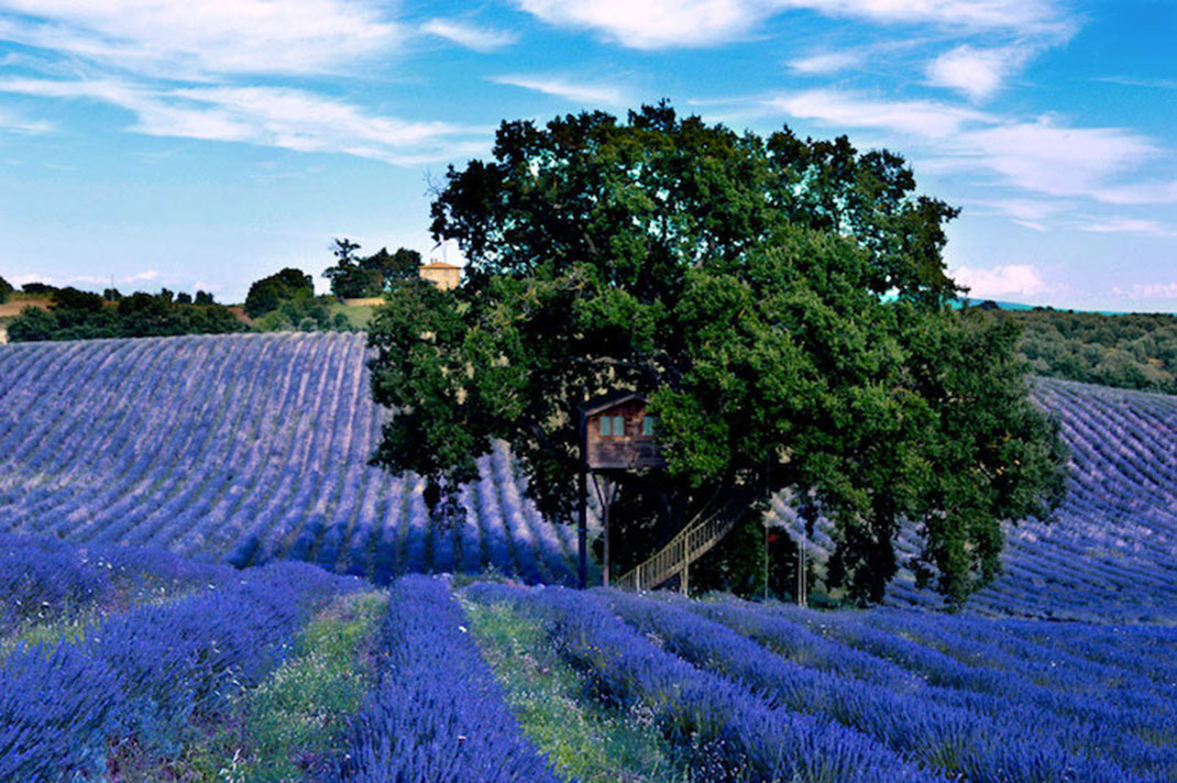 Designed by the same designers behind “La Cabane Perched”, a house of the same type, Blue Suite is located eight meters above the ground in a tree and surrounded by about 12 hectares of lavender plants, offering its residents an exceptionally good view.