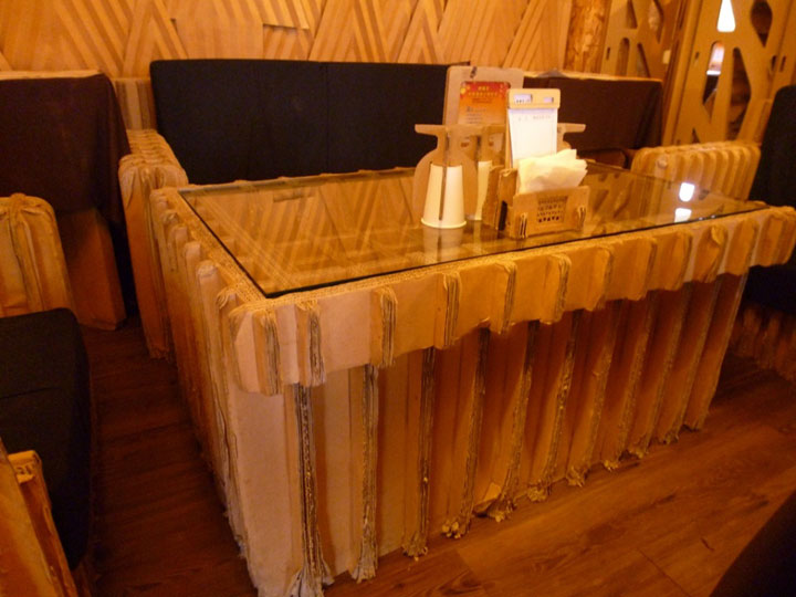 Located in Taiwan and more specifically in the city of Taichung, the restaurant Carton King offers the guests an opportunity to sit on the chairs entirely made from cardboard. All others objects in the restaurant like tables, cabins, distributors, toilet paper, bowls and cup holders etc are also made from cardboard.
