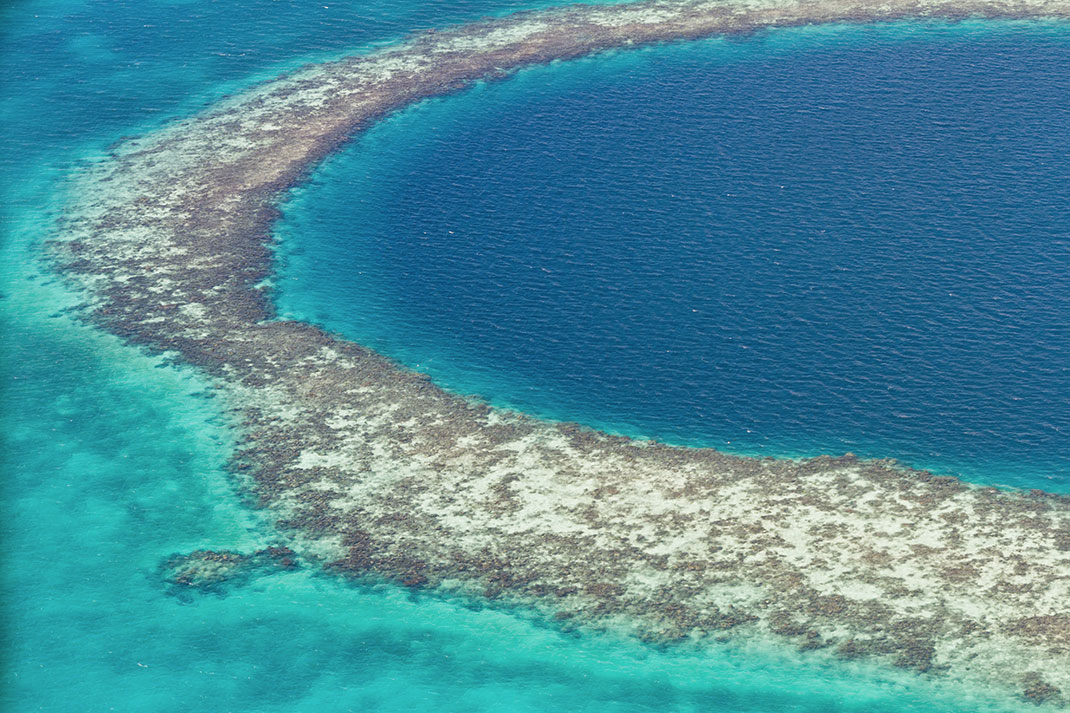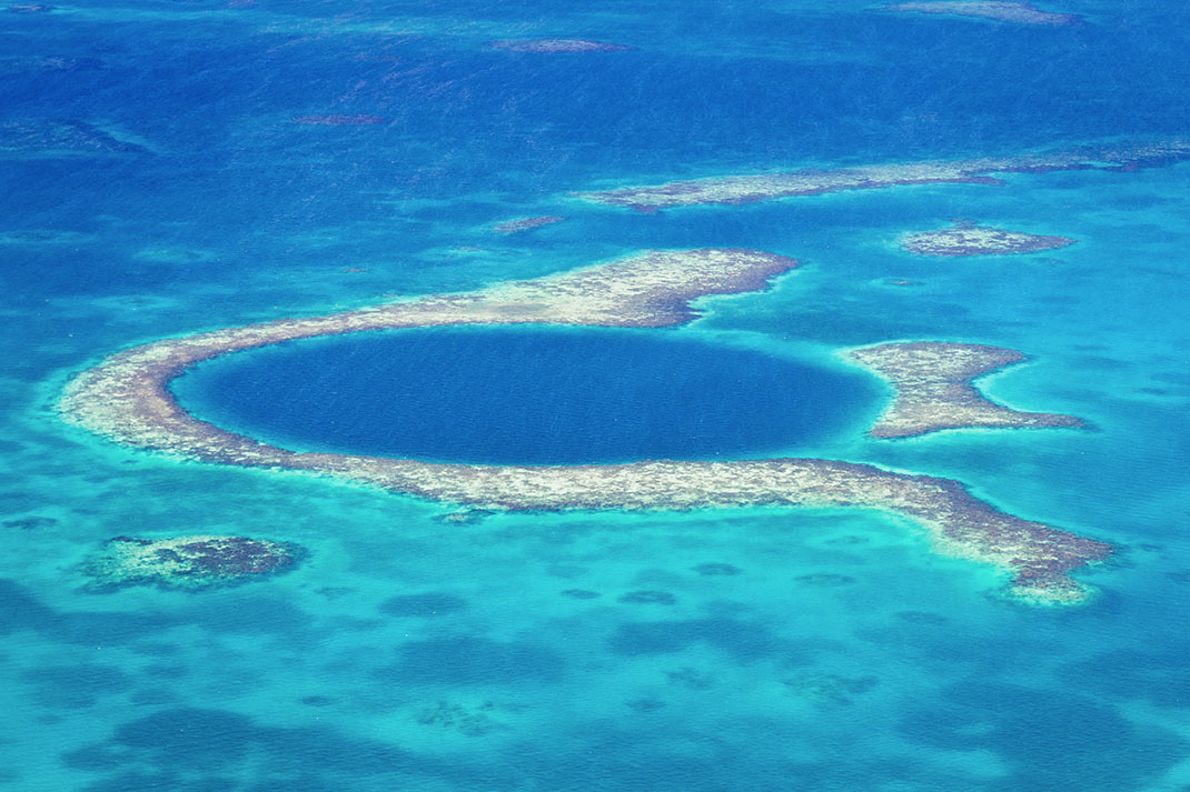 The Great Blue Hole is a chasm formed by erosion of soluble rock, here limestone, filled with water. Located off the coast of Belize, in Central America, the geological formation is part of a group of small low-lying islands, made of sand and coral, and called the Belize Barrier Reef.