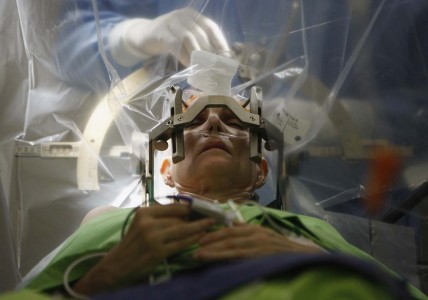 A woman lies on an operating table during a brain surgery at the National Neurology Institute in Budapest December 15, 2012. The complex operation, called deep brain stimulation (DBS) and involves stimulation of certain areas of the human brain with high-frequency electricity, is carried out with the patient awake and communicating with the doctors during certain phases of the operation. REUTERS/Bernadett Szabo (HUNGARY – Tags: HEALTH) ORG XMIT: BUD01
