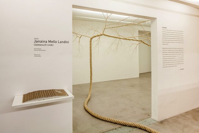 Originally from Minas Gerais but based in São Paulo, Janaina Mello Landini (São Gotardo, MG, 1974) aggregates her knowledge of architecture, physics and mathematics and her perception on time to develop pieces that travel through different scales. The labyrinthine architecture has been the central axis of her research in the “Ciclotramas” series, made with ropes that break down into minimal threading, and “Labirintos Rizomáticos”, works in satin that result in the construction of multifocal perspectives, nullifying the traditional construction.