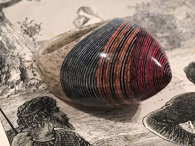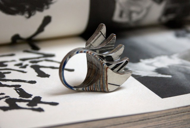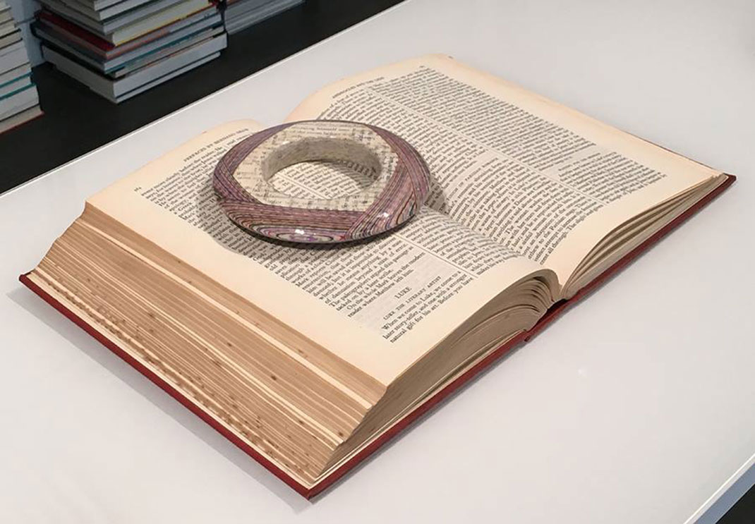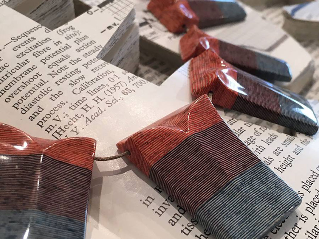 In general, the Englishman uses books that we find in in old libraries. Then he detaches pieces of inside pages (one hundred pages each time). After laminating them, he applies a varnish to make them more beautiful. When finished, May likes to place the Jewelery on the book from which it was made.