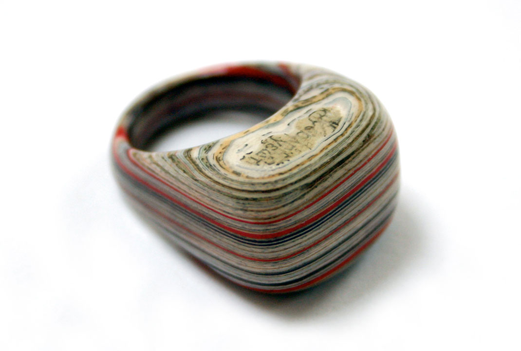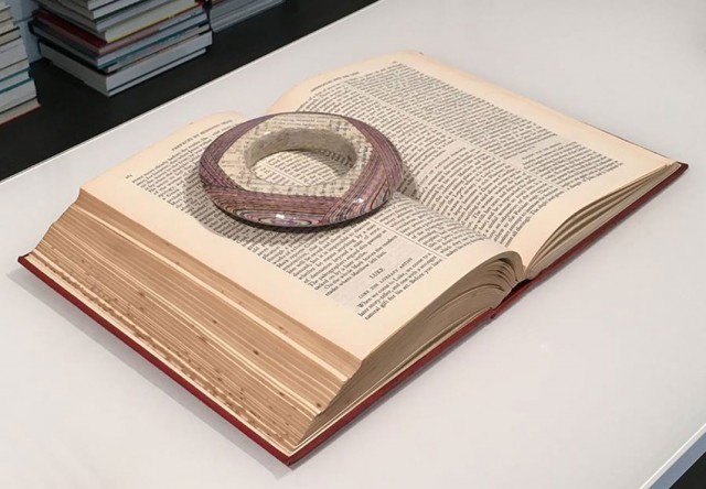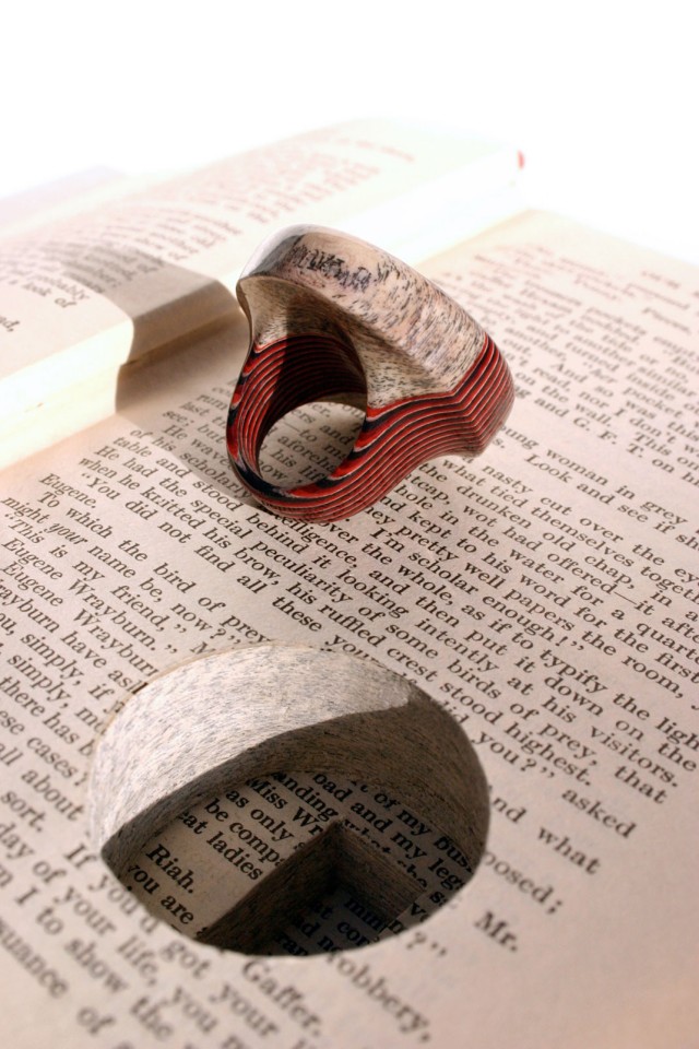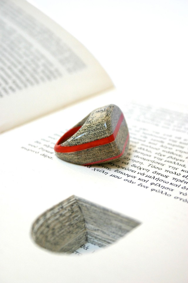 The London artist Jeremy May revives old and abandoned books. He reuses them to design jewelry of any kind (rings, necklaces). These are real small sculptures that can be carried and which are original and unique. We see the few sentences and images from the book or images used in these chiseled and delicate creations.