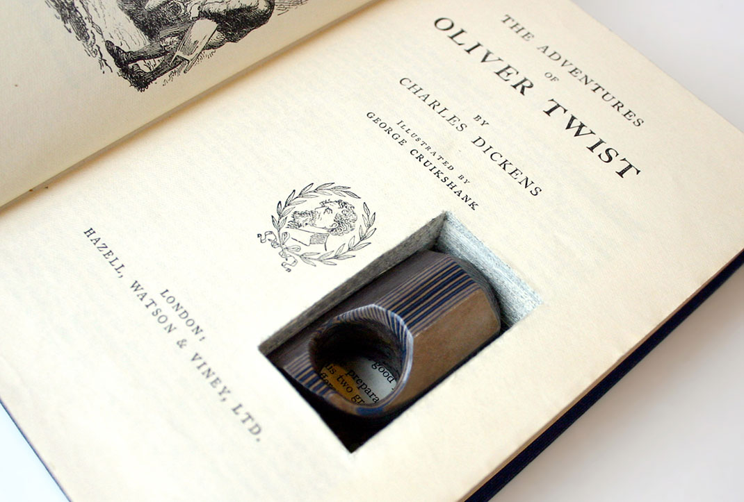 In general, the Englishman recovered works that inspire in old libraries. Then he detaches pieces of inside pages (one hundred pages each time). After laminating, he applies a varnish to give them a brilliant look. When finished, May likes to have the jewel on the book used initially.
