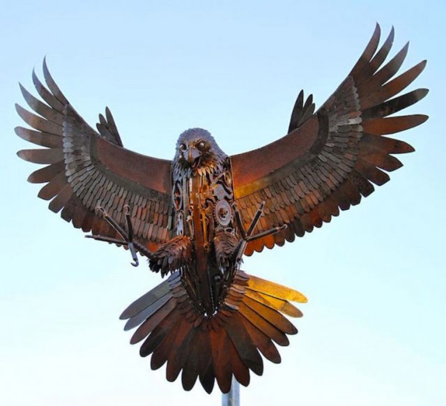 During a long and complicated process, the artist transforms scrap metal into beautiful metallic-sized animals. To design the Nerembeen Hawk, for example, it took him 260 hours of work. For Jordan Sprigg ha had to individually cut 1,000 feathers involved in very imposing size of the animal, which is 2.5 meters.