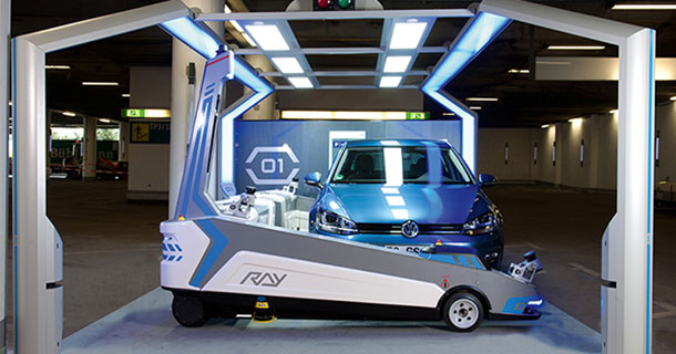 Ray is a bit like Alfred, the butler, who takes care of everything. If you arrive by car in the parking of Düsseldorf Airport, Ray takes care of parking the car for you. It is handy if you are in a hurry to catch your flight. Ray has been designed by the German manufacturer Serva Transport system. It is in the form of a wheeled forklift, capable of lifting and moving cars. The customer left his car in a defined area and Ray will do the rest. It analyzes the size of the vehicle park and determines the ideal location in relation to availability.