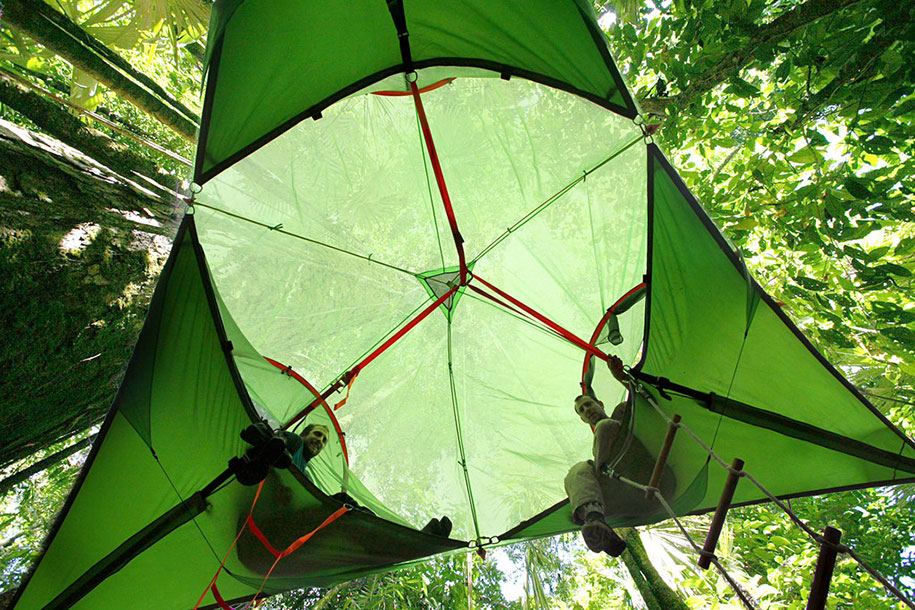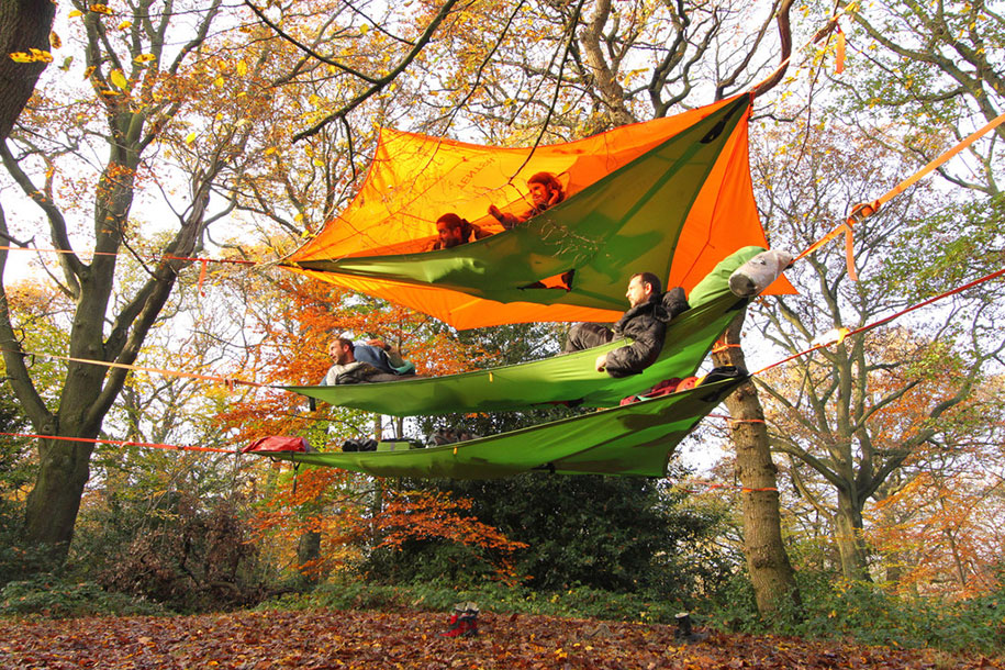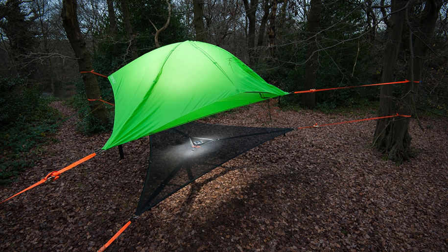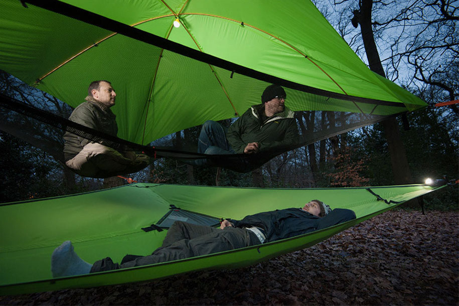 For the lover of camping, one of the most problematic activities is to find a suitable flat ground where to put up your camp. Sometimes, the ground is flat but it has bushes or animal burrows in it. Not to mention the dangers of finding the snakes and other harmful insects. Well for all such situations, Tentsile has come to the rescue. With this unique camping solution you do not need to find the ground. In fact, the tent hangs from the trees a meter above the ground. This tent has three different types of the variants: the Trillium hammock can be regarded as the smallest and the basic model, its triangular shaped structure can easily accommodate three people. Vista is a multi-story model that can be regarded as the extension of the basic Trillium design. However, its suitability is not guaranteed under the extreme weather conditions. Trilogy model ingeniously combines three tents and a central canopy to form the biggest hammock model.