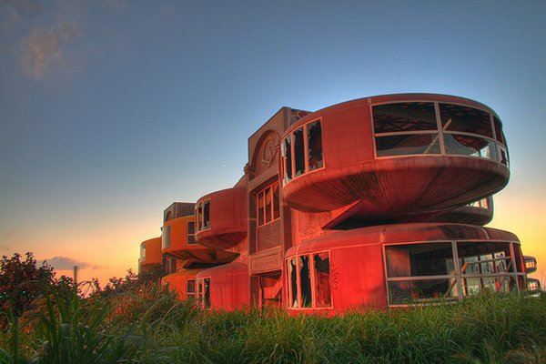 A futuristic holiday center project, quickly abandoned due to lack of funding and accidents during construction.